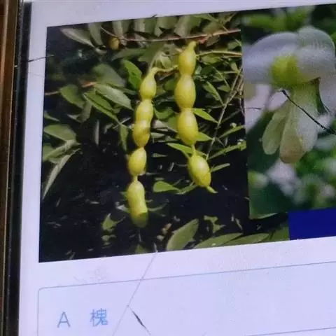 槐为落叶乔木,高8-20m。树皮灰棕色,具不规则纵裂, 槐花 内皮鲜黄色,具臭味;嫩枝暗绿褐色,近光滑或有短细毛,皮孔明显。奇数现状复叶,互生,长15-25cm,叶轴有毛,基部膨大;小叶7-15,柄长约2mm,密生白色短柔毛;托叶镰刀状,早落;小叶片卵状长圆形,长2.5-7.5cm,宽1.5-3cm,先端渐尖具细突尖,基部宽楔形,全缘,上面绿色,微亮,背面优生白色短毛。圆锥花序顶生,长15-30cm;萼钟状,5浅裂;花冠蝶形,乳白色,旗瓣阔心形,有短爪,脉微紫,翼瓣和龙骨瓣均为长方形;雄蕊10,分离,不等长;于房筒状,有细长毛,花柱弯曲。荚果肉质,串珠状,长2.5-5cm,黄绿色,无毛,不开裂,种子间极细缩。种子1-6颗,肾形,深棕色。花期4-5月,果期10-11月。