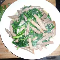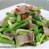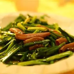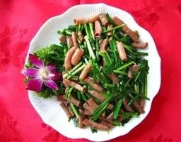 原料:鲜芥兰150克、香肠100克、生姜10克。花生油150克、盐10克、味精8克、白糖2克、湿生粉适量、麻油少许。