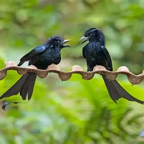 发冠卷尾是中型鸟类,体长28-35厘米。通体绒黑色缀蓝绿色金属光泽,额部具发丝状羽冠,…