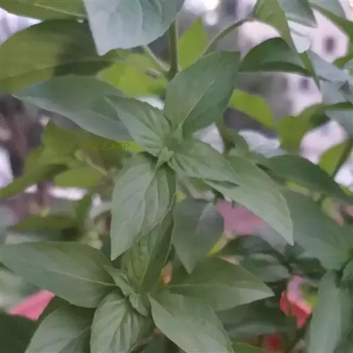圣罗勒(O.cimum sanctum),基部木质化,花白色或粉红色,叶片上有毛,叶缘有齿,具香辣味。
