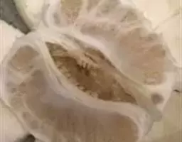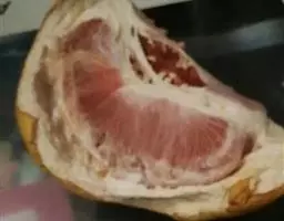 果扁圆或近似梨形,大小不一,大的径达8厘米,小的约4厘米,果顶有环状突起及浅放射沟,蒂部有时也有放射沟果皮祖糙,凹点均匀,油胞大,皮厚2-4毫米,淡红色,较易剥离,瓢囊9-11瓣,囊壁厚而韧,果肉淡黄白色,味甚酸,常有苦味或异味;种子多达40粒,阔卵形,饱满,平滑,子叶乳白色,单或多胚。花期4-5月,果期10-11月。