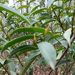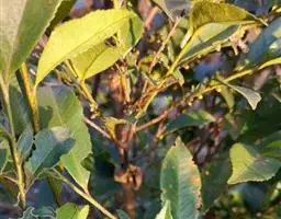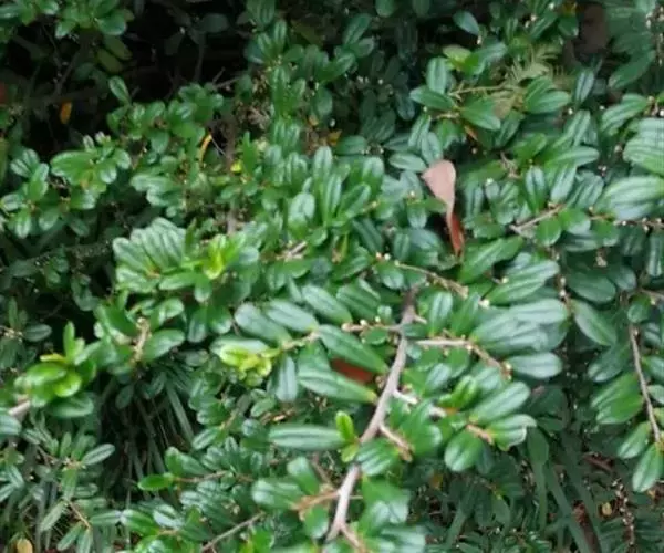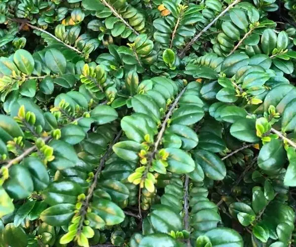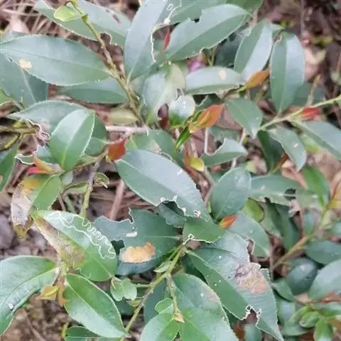 灌木,高1-2米;嫩枝圆柱形,极稀稍具棱,粗壮,红棕色,密被黄褐色短柔毛,小枝灰褐色或红褐色,无毛或几无毛;顶芽长锥形,被短柔毛或几无毛。叶厚革质,倒卵形或倒卵状披针形,长2-3厘米,宽1.2-1.8厘米,顶端圆而有微凹,基部楔形,边缘有细微锯齿,齿端具黑色小点,稍反卷,上面绿色或深绿色,稍有光泽,下面黄绿色或淡绿色,两面均无毛,中脉在上面凹下,下面隆起,侧脉约5对,纤细,连同网脉在上面凹下,下面稍隆起;叶柄长2-3毫米,无毛。