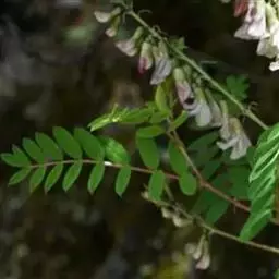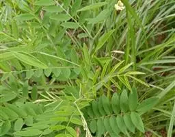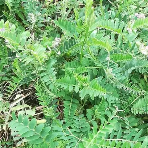 草本,或基部木质化成亚灌木状,高约1米。枝被白色或淡灰白色长柔毛或贴伏柔毛。羽状复叶;叶柄长1-2厘米;托叶着生于小叶柄的侧面,钻状,长约5毫米,常早落;小叶7-13对,对生或近互生,纸质,披针状长圆形或椭圆状长圆形,长15-30毫米,宽约10毫米,先端钝圆或急尖,常具小尖头,基部宽楔形或圆形,上面被疏柔毛,下面毛被较密,中脉上面常凹陷,下面隆起,侧脉不明显。