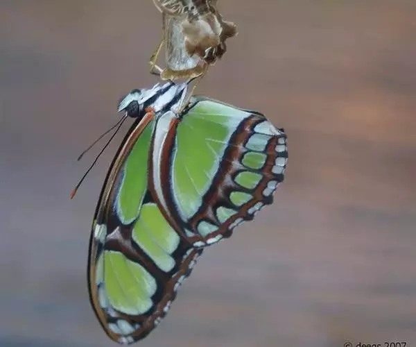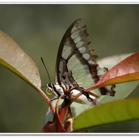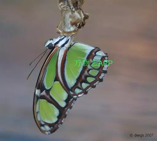 二尾蛱蝶的悬蛹外形就好象一个挂在枝条上的果实,再加上翠绿色的外表,以保护自己不受天敌伤害。