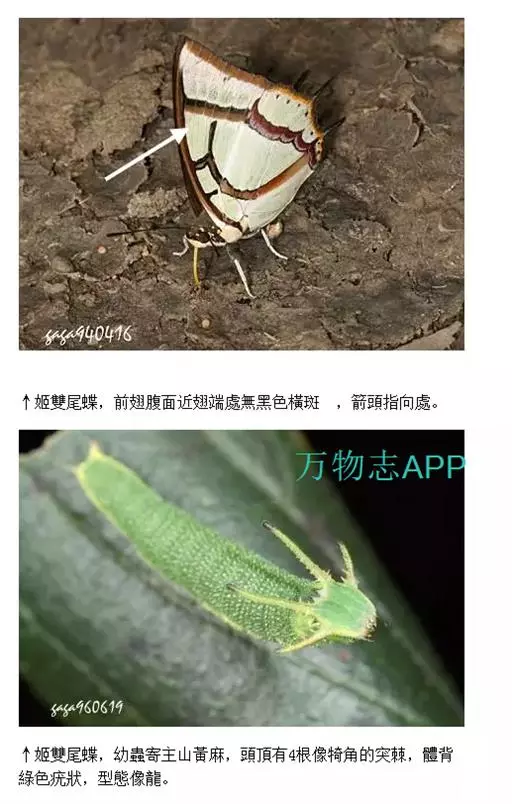 二尾蛱蝶的一龄幼虫从卵钻出来就已经有四只角了,但中间的一对明显较长。而进入二龄后与外侧角的大小比 例便缩小了。头部也从黑褐色渐渐转为绿色。尾须也渐渐变短。
