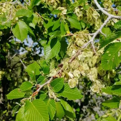 树皮暗灰色,粗糙,不规则纵裂。幼树枝条直立,且被白色毛;老树枝条先端下垂,有时木栓质发达成为瘤状。落叶乔木,高达30m。叶片倒卵状椭圆形或广倒卵形,先端急尖,基部楔形、偏斜,长8cm~12cm,宽3cm~7cm,叶缘具重锯齿和缘毛,上表面深绿色,背面淡绿色;叶脉羽状,侧脉15对~20对;叶柄密生或疏生白色短绒毛。花早春先叶开放,老枝上为束状聚伞花序,深紫色;花两性;花萼钟形,4浅裂;雄蕊4枚,雌蕊由2心皮组成。翅果扁平,倒卵形,无毛或仅在顶端凹陷处被毛;种子位于翅果的上部,上端接近凹陷处,周围均具膜质的翅。花期4~5月;果熟期5~6月。