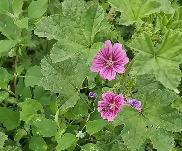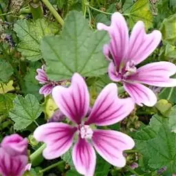 锦葵(学名:Malva sinensis Cavan.):二年生或多年生直立草本,高50-90厘米,分枝多,疏被粗毛。叶圆心形或肾形,具5-7圆齿状钝裂片,两面均无毛或仅脉上疏被短糙伏毛。花3-11朵簇生,小苞片3,长圆形疏被柔毛;花紫红色或白色,直径3.5-4厘米,花瓣5,匙形,长2厘米,先端微缺,爪具髯毛。果扁圆形,分果爿9-11,肾形,被柔毛;种子黑褐色,肾形,长2毫米。花期5-10月。