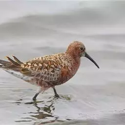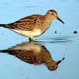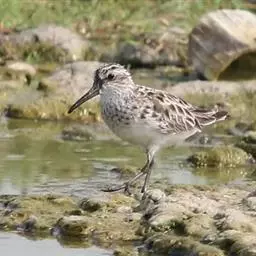 黑腹滨鹬(学名:Calidris alpina)是鹬科滨鹬属鸟类。小型涉禽,体长16-22厘米。嘴黑色、较长,尖端微向下弯曲,脚黑色。 夏季背栗红色具黑色中央斑和白色羽缘。眉纹白色。下体白色,颊至胸有黑褐色细纵纹。腹中央黑色,呈大型黑斑。冬羽上体灰褐色,下体白色,胸侧缀灰褐色。飞翔时翅上有显著的白色翅带,腰和尾黑色,腰和尾的两侧为白色,野外特征甚明显。特别是夏羽,仅通过腹部大型黑斑和栗红色的背,就很容易的与其他鹬类相区别。但冬羽和弯嘴滨鹬、阔嘴鹬非常相似,野外鉴别较困难。不过弯嘴滨鹬嘴较长而细,向下弯曲弧庋较大,脚亦较长,腰白色, 两侧不为黑色;阔嘴鹬体形较小,脚亦较短,具双道白色眉纹,野外容易区别。