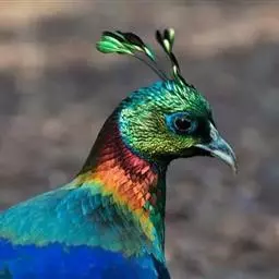 蓝马鸡通体蓝灰色,颈项和肩部颜色更深,闪烁着金属般的辉亮,尾羽由灰蓝色渐变为暗紫蓝色,并渲染着金属绿和金属紫蓝色。蓝马鸡有24枚尾羽,中央一对尾羽特别长,富有弹性,弯曲成一个美丽的弧形,高高地翘在其他尾羽之上,是4种马鸡中尾羽最专化的。