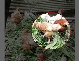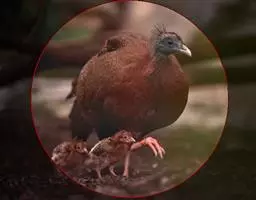 刚出壳的蓝马鸡羽毛松散如丝,嘴肉红色,虹膜黑褐色,额、脸淡棕色,耳羽前部淡棕、后部黑色,头顶棕白色,背部有二条不明显的淡色纵纹。胸、腹灰白色。脚肉色。