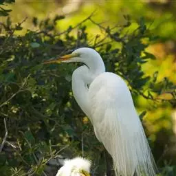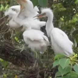 大白鹭 体态纤瘦,乳白色:夏羽的成鸟繁殖时枕部着生两条狭长而软的矛状羽,状若双辫;肩和胸着生蓑羽,冬羽时蓑羽常全部脱落,虹膜黄色;脸的裸露部分黄绿色,嘴黑色,嘴裂处及下嘴基部淡角黄色;胫与脚部黑色,趾呈角黄绿色。通常简称为白鹭。小白鹭场栖息于稻田、沼泽、池塘间,以及海岸浅滩的红树林里。常曲缩一脚于腹下,仅以一脚独立。白天觅食,好食小鱼、蛙、虾及昆虫等。繁殖期3~7月。繁殖时成群,常和其他鹭类在一起,雌雄均参加营巢,次年常到旧巢处重新修葺使用。卵蓝绿色,壳面滑。雌雄共同抱卵。卵23天出雏。