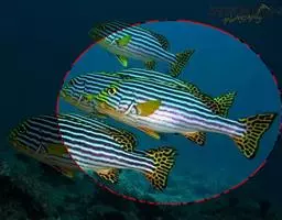 眼斑双锯鱼,背鳍硬棘被橘黄色斑块分割为5-6枚,第4枚最长,约为头长的2.1-2.9倍。胸鳍、臀鳍…