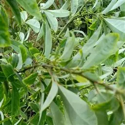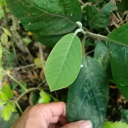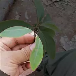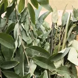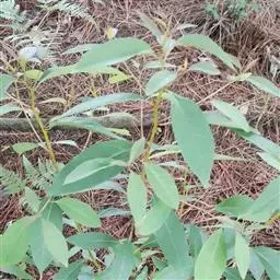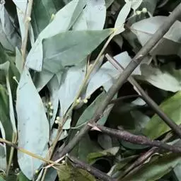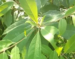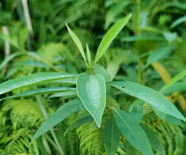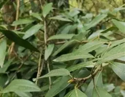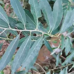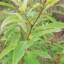 叶互生,纸质,有香气,披针形或长圆状披针形,长7-11厘米,宽1.4-2.4厘米,先端渐尖,基部楔形,全缘,上面深绿色,下面粉绿色,苍白色。两面均无毛,羽状脉,侧脉每边6-10条,纤细,中脉、侧脉在两面均突起;叶柄长6-20毫米,纤细,无毛。