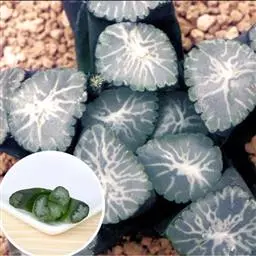 叶高度肉质,肥厚柔软,两侧圆凸,舟形,先端肥大呈圆头状;叶翠绿色,顶端呈透明或半透明状,俗称“窗”,其表面有蓝绿色线状脉纹,叶尖有细小的丝状须。