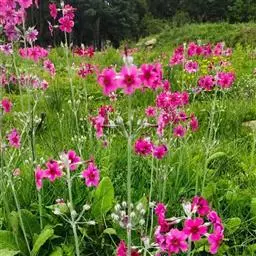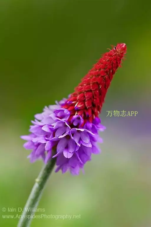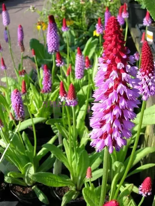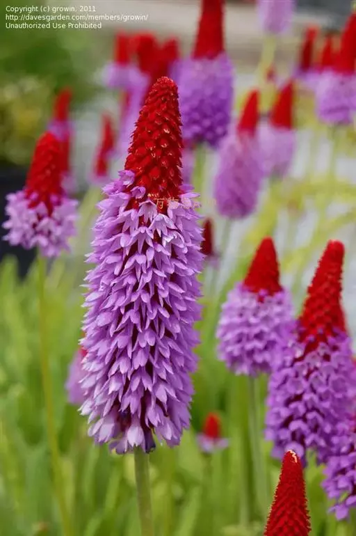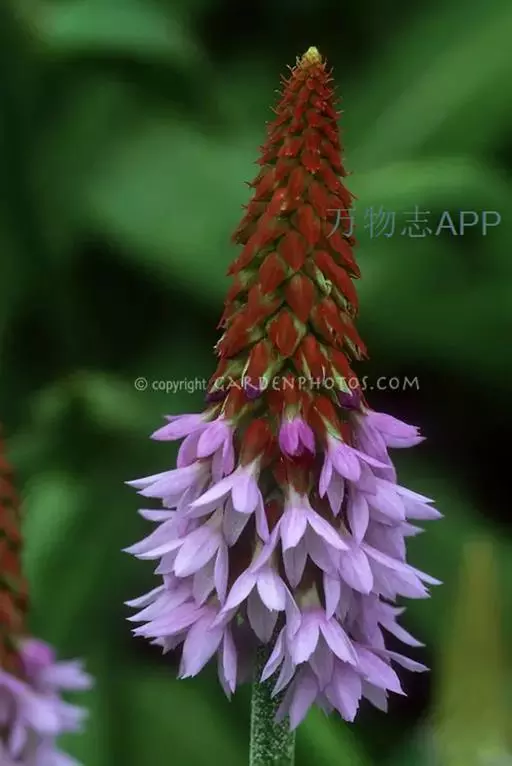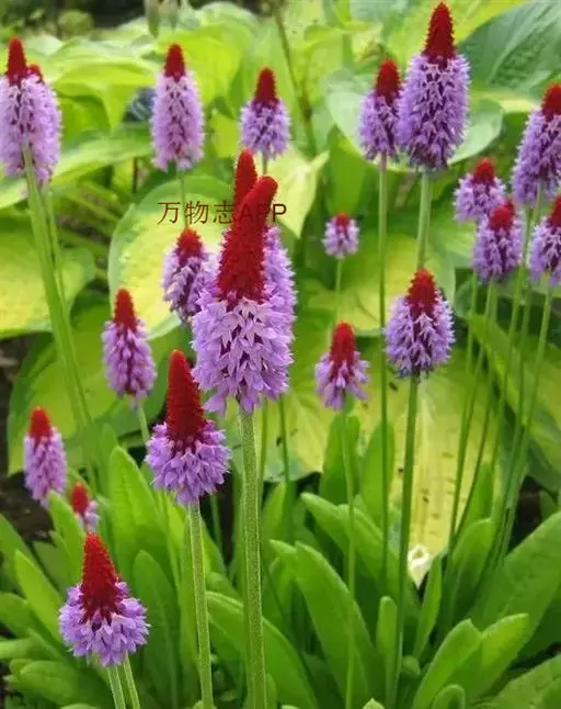高穗花报春(学名:Primula vialii Delavay ex Franch.):报春花科,报春花属多年生草本植物,根状茎短,侧根粗长。叶狭椭圆形至矩圆形或倒披针形,先端圆钝,边缘小牙齿,两面均被柔毛,叶柄通常短于叶片,花葶高可达60厘米,无毛,穗状花序多花,花未开时呈尖塔状,花全部开放后呈筒状,苞片线状披针形,花蕾期外面深红色,后渐变为淡红色,花冠蓝紫色,裂片卵形至椭圆形,雄蕊近冠筒口着生,蒴果球形,稍短于宿存花萼。7月开花。