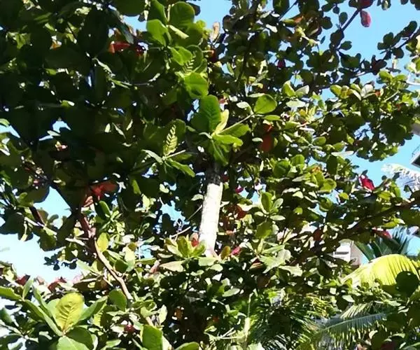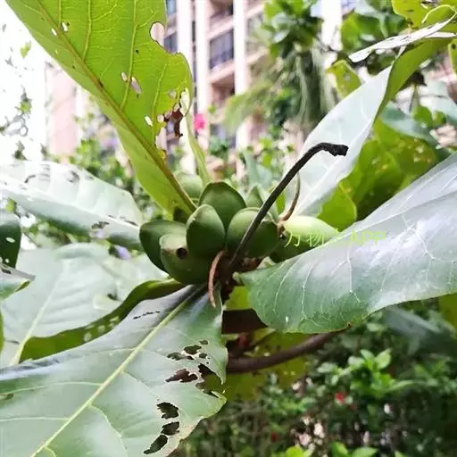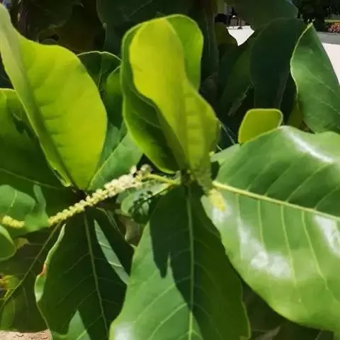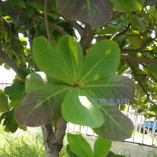 榄仁树(学名:Terminalia catappa L.)是使君子科诃子属植物,大乔木,高15米或更高,树皮褐黑色,纵裂而剥落状;枝平展,近顶部密被棕黄色的绒毛,具密而明显的叶痕。叶大,互生,常密集于枝顶,叶片倒卵形,长12-22厘米,宽8-15厘米。穗状花序长而纤细,腋生,长15-20厘米,雄花生于上部,两性花生于下部。果椭圆形,常稍压扁,具2棱,棱上具翅状的狭边,两端稍渐尖,果皮木质,坚硬,成熟时青黑色;种子一颗,含油质。花期3-6月,果期7-9月。