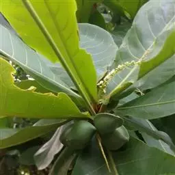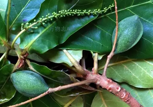 穗状花序长而纤细,腋生,长15-20厘米,雄花生于上部,两性花生于下部;苞片小,早落;花多数,绿色或白色,长约10毫米;花瓣缺;萼筒杯状,长8毫米,外面无毛,内面被白色柔毛,萼齿5,三角形,与萼筒几等长;雄蕊10枚,长约2.5毫米,伸出萼外;花盘由5个腺体组成,被白色粗毛;子房圆锥形,幼时被毛,成熟时近无毛;花柱单一,粗壮;胚珠2颗,倒悬于室顶。果椭圆形,常稍压扁,具2棱,棱上具翅状的狭边,长3-4.5厘米,宽2.5-3.1厘米,厚约2匣米,两端稍渐尖,果皮木质,坚硬,无毛、成熟时青黑色;种子一颗,矩圆形,含油质。花期3-6月,果期7-9月。