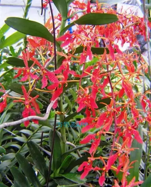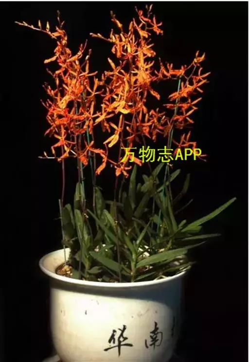 麒麟火焰兰 麒麟火焰兰,株型直立,叶带形、绿色、质硬;花色橙红,带鲜红色的斑点;花葶直径约3.0毫米,长可达43厘米以上,分枝数0—4个,主枝着生花朵数可达16—20朵,总花朵数可达25朵以上,花朵长约5.0厘米、宽约6.0厘米。在广州地区简易大棚栽培2月底到3月初开花,花期长可达2—3个月,表现出较强的耐热性、耐冷性以及抗病性。