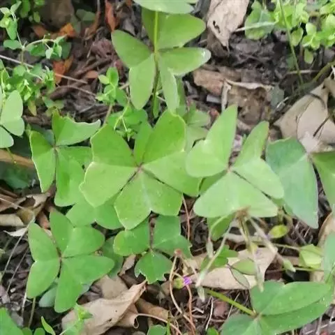 叶基生;叶柄长5-30厘米或更长,被毛;小叶3,扁圆状倒心形,长1-4厘米,宽1.5-6厘米,顶端凹入,两侧角圆形,基部宽楔形,表面绿色,被毛或近无毛;背面浅绿色,通常两面或有时仅边缘有干后呈棕黑色的小腺体,背面尤甚并被疏毛;托叶长圆形,顶部狭尖,与叶柄基部合生。总花梗基生,二歧聚伞花序,通常排列成伞形花序式,总花梗长10-40厘米或更长,被毛;花梗、苞片、萼片均被毛;花梗长5-25毫米,每花梗有披针形干膜质苞片2枚;萼片5,披针形,长约4-7毫米,先端有暗红色长圆形的小腺体2枚,顶部腹面被疏柔毛;花瓣5,倒心形,长1.5-2厘米,为萼长的2-4倍,淡紫色至紫红色,基部颜色较深;雄蕊10枚,长的5枚超出花柱,另5枚长至子房中部,
