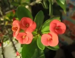 铁海棠(学名:Euphorbia milii Ch. des Moulins):是双子叶植物纲、大戟科的蔓生灌木。茎多分枝,长60-100厘米,直径5-10毫米,具纵棱,密生硬而尖的锥状刺,常呈3-5列排列于棱脊上,呈旋转。叶互生,通常集中于嫩枝上,倒卵形或长圆状匙形,全缘;托叶钻形,长3-4毫米,极细,早落。花序2. 4或8个组成二歧状复花序,生于枝上部叶腋;总苞钟状,高3-4毫米,直径3.5-4.0 毫米,边缘5裂,裂片琴形,上部具流苏状长毛,且内弯;腺体5枚,肾圆形,黄红色。雄花数枚;苞片丝状,先端具柔毛;雌花1枚。蒴果三棱状卵形,平滑无毛,成熟时分裂为3个分果爿。种子卵柱状,灰褐色,具微小的疣点;无种阜。花果期全年。