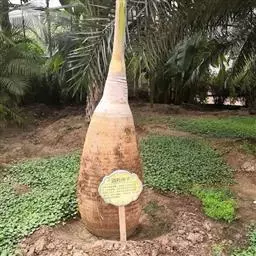 单干,树干短,肥似酒瓶,树高可达3米以上,胸径达38-60厘米。羽状复叶,叶长1.8-2.2米,小叶披针形,长约45厘米,宽3.8-5厘米,40-60对,中脉和侧脉凸起。叶柄长30-45厘米,淡红色,没有黄色的条纹。呈弓形后弯,叶鞘圆筒形。小苗时叶柄及叶面均带淡红褐色。雌雄同株,花柄长60厘米,佛焰苞柔软,长60厘米。果长3厘米,宽2.5厘米,表面粗糙,形状不规则,种子小而扁平。呈球状,长约1.3厘米。