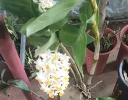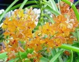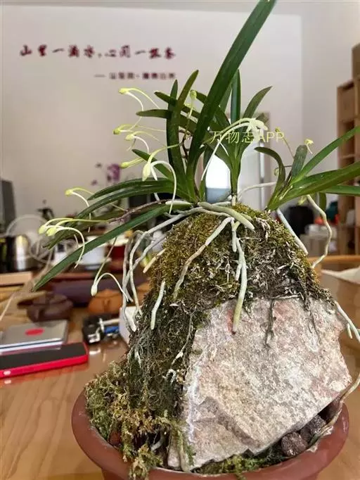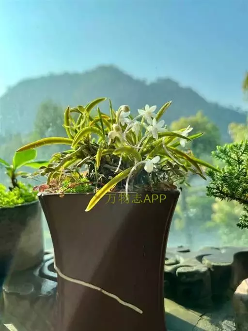 风兰(学名:Neofinetia falcata (Thunb. ex A. Murray) H. H. Hu):植株高8-10厘米。茎长1-4厘米,稍扁,被叶鞘所包。叶厚革质,狭长圆状镰刀形。总状花序长约1厘米,具2-5朵花;花白色,芳香;花瓣倒披针形或近匙形,长8-10毫米,宽2.2-3毫米,先端钝,具3条脉;唇瓣肉质,3裂。花期4月。