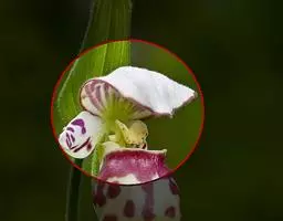 花瓣倒披针形或近匙形,长8-10毫米,宽2.2-3毫米,先端钝,具3条脉;唇瓣肉质,3裂;侧裂片长圆形,长3.5-4毫米,宽0.8-1毫米,先端钝;中裂片舌形,长7-8毫米,宽2-2.5毫米,先端钝并且凹缺,基部具1枚三角形的胼胝体,上面具3条稍隆起的脊突;距纤细,弧形弯曲,长3.5-5厘米,粗1.5-2毫米,先端稍钝;蕊柱长约2毫米;蕊柱翅在蕊柱上部扩大成三角形;药帽白色,两侧褐色,前端收狭成三角形。花期4月。