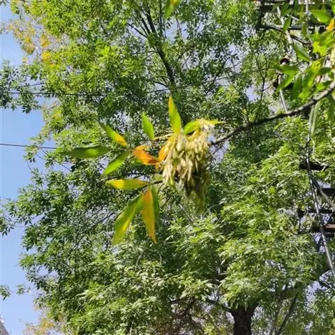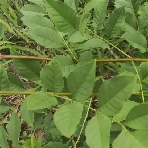 落叶大乔木,高达19米,胸径达1.5米;树皮深灰色,老时纵裂;营养枝常呈棘刺状。小枝挺直,被细绒毛或无毛。羽状复叶长7-15厘米;叶柄长3厘米,基部不增厚;叶轴具狭翅,小叶着生处有关节,至少在节上被短柔毛;小叶7-9(-11)枚,革质,披针形至卵状披针形,长1.7-5厘米,宽0.6-1.8厘米,先端渐尖,基部楔形,叶缘具锐锯齿,上面无毛,下面沿中脉基部被短柔毛,侧脉6-7对;小叶柄长3-4毫米,被细柔毛。
