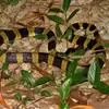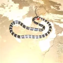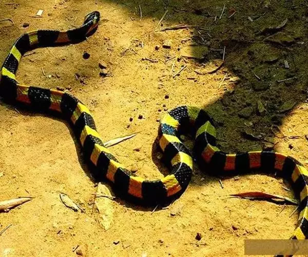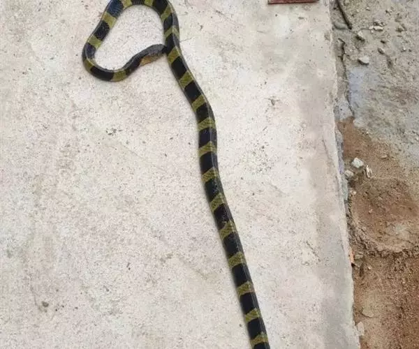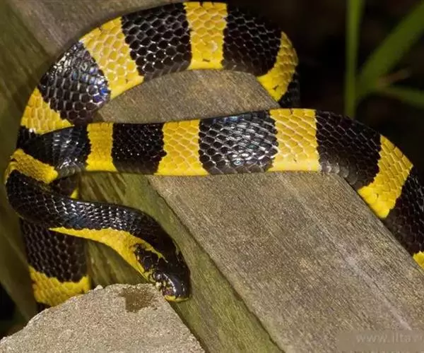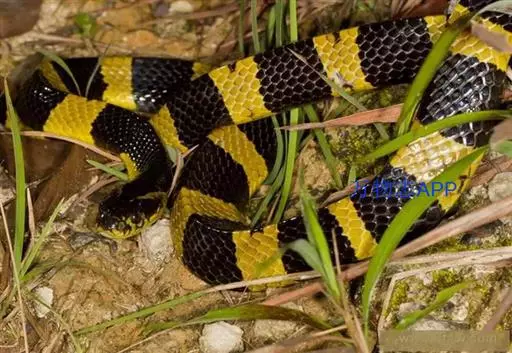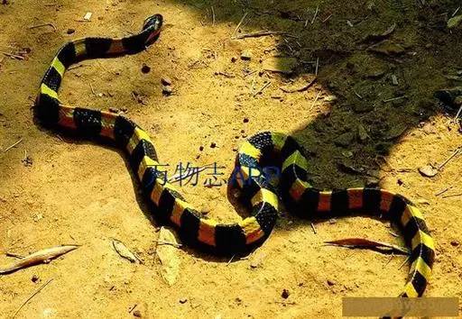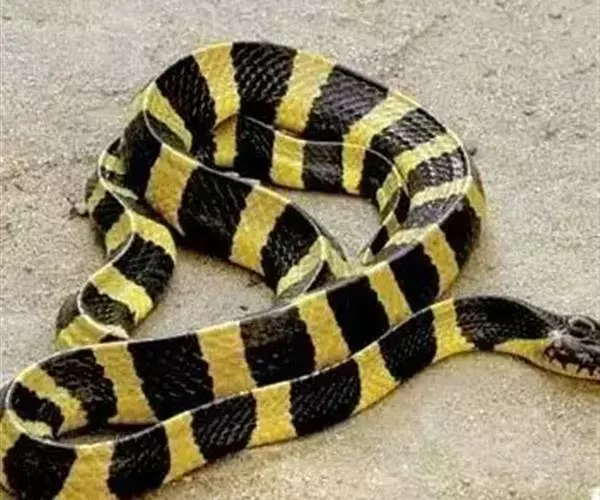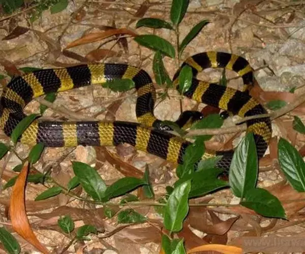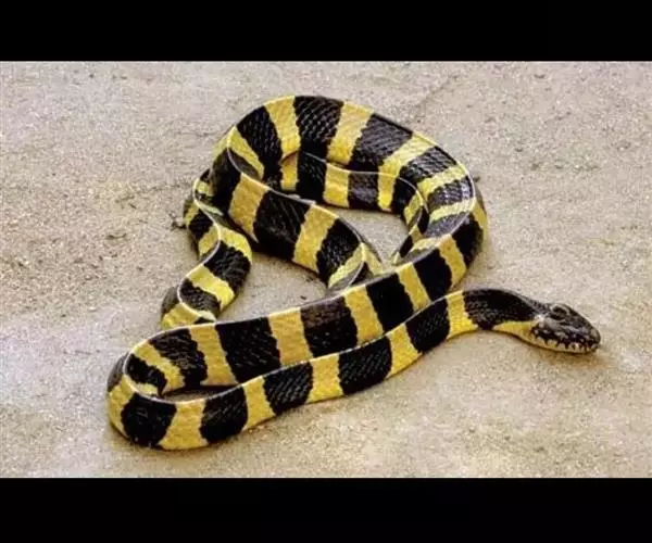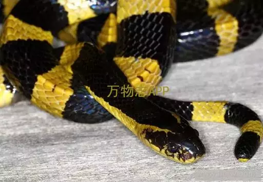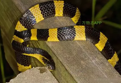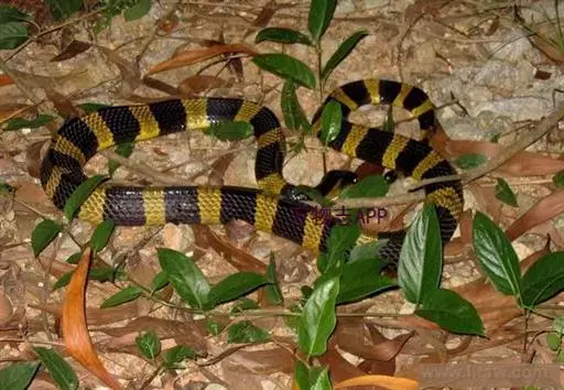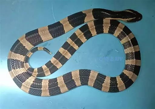 金环蛇全长983—1,500mm,具有前沟牙。头呈椭圆形,尾极短, 图2:金环蛇 尾略呈三棱形,尾末端钝圆而略扁,通身呈黑色与黄色相间的少数明显的棱骨,黑色环纹和黄色环纹几乎等宽,黄色环纹在体部有20—28环,黑色环纹20—26+3—5。在尾部有3—5环,背鳞平滑共15行,背中央的1行鳞片特别大,肛磷完整,尾下鳞片为单行,腹部为灰白色。头背黑褐色,枕及颈部有污黄色的“∧”形斑。背脊隆起呈脊,所以躯干横切面略呈三角形,尾末端圆钝。头椭圆形,与颈区分较不明显,头背具有典型的9枚大鳞片,背鳞平滑,全身15行,背正中一行脊鳞扩大呈六角形。