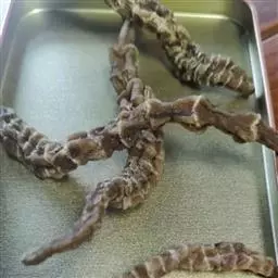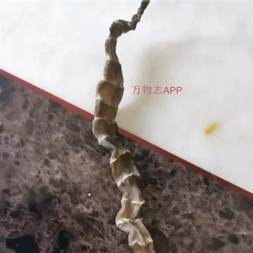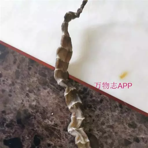 性状鉴别,本品呈圆盘形,盘径14—20cm,头居中,椭圆形,黑褐色,鼻尖向前不上翘,通体具23—33对黄黑相间的色环,黄黑等宽,体背有明显脊棱,脊棱鳞片扩大呈六边形,尾短末端钝圆。质坚韧。气腥,味咸。背鳞鳞片椭圆形,长6.5—7.0mm,宽4.5—5.0mm,黄褐色,上半部边缘整齐,具8—13个小孔,无中肋,无端窝,表面平滑,透明。背棱脊处鳞片扩大呈六边形,有孔30—34个,不规则分布于鳞片上半部,也无中肋,无端窝。质韧,不易折断。气微,味淡。