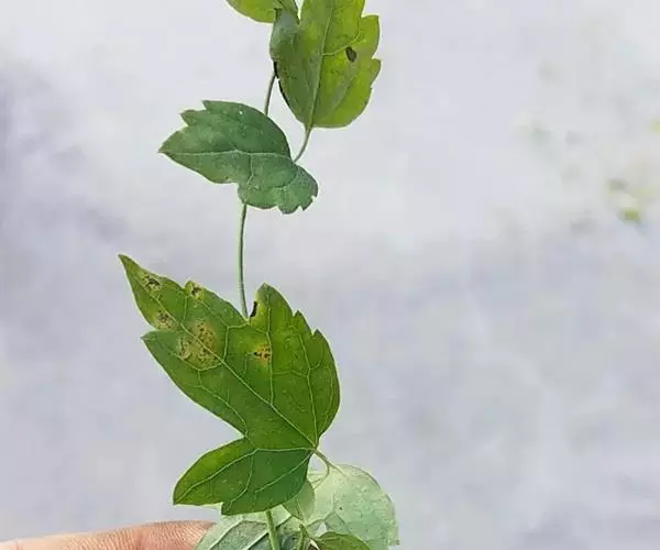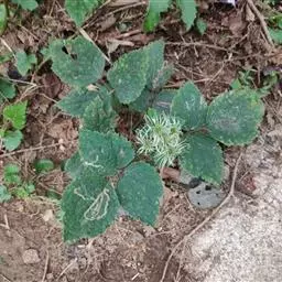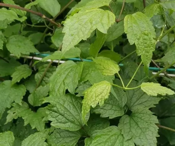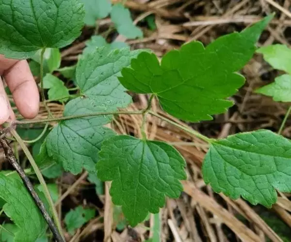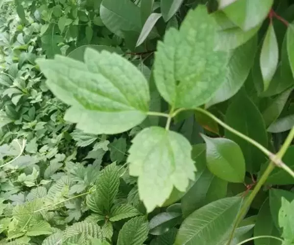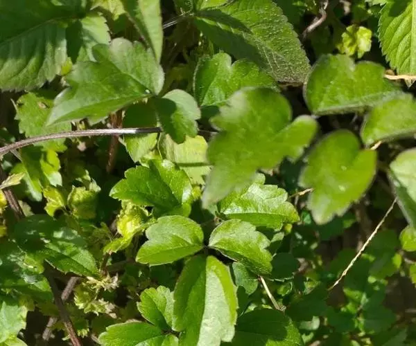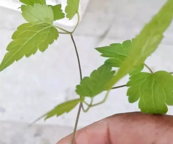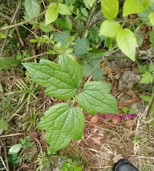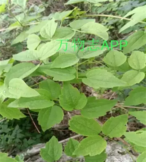 藤本。小枝和花序梗、花梗密生贴伏短柔毛。三出复叶,连叶柄长5-17厘米,叶柄长3-7厘米;小叶片卵形或宽卵形,长2.5-8厘米,宽1.5-7厘米,常有不明显3浅裂,边缘有锯齿,上面疏生贴伏短柔毛或无毛,下面通常疏生短柔毛或仅沿叶脉较密。
