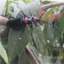 桃红颈天牛是天牛科、颈天牛属昆虫。体黑色发亮,前胸背面大部分为光亮的棕红色或完全黑色。头黑色,…