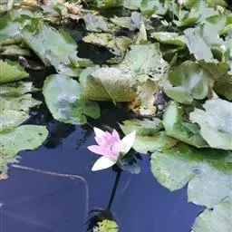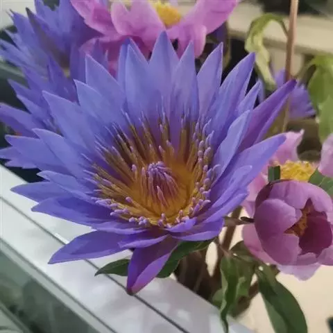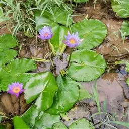 蓝鸟(学名:Nymphaea 'Blue Bird'):是多年生水生草本;根状茎肥厚。叶二型:浮水叶圆形或卵形,基部具弯缺,心形或箭形,常无出水叶;沉水叶薄膜质,脆弱。花形美丽,浮在或高出水面;萼片4,近离生;花瓣成多轮,心皮环状,贴生且半沉没在肉质杯状花托,且在下部与其部分地愈合,上部延伸成花柱,柱头成凹入柱头盘,胚珠倒生,垂生在子房内壁。浆果海绵质,不规则开裂,在水面下成熟;种子坚硬,为胶质物包裹。
