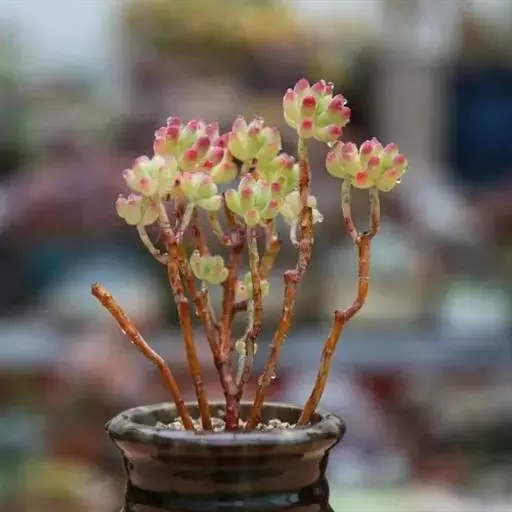 乙女心植株较粗壮,且容易繁衍。淡绿色的叶子在秋冬的时候会在叶尖乃至整个叶片呈现绮丽的粉红色,放置在干燥温差大的地方颜色会更加鲜艳美丽。乙女心茎部不太粗但能够形成木质的枝干,会随着时间的推移而逐渐群生。