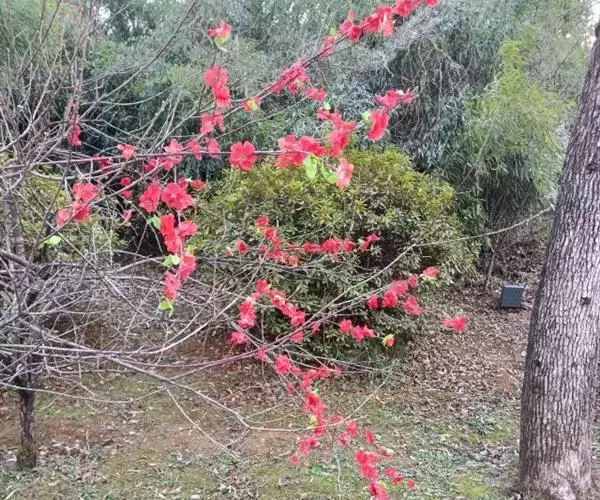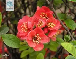 枝干是红褐色而且有光亮的,叶片为椭圆状或者披针形,花为红色。4月份开花,7-8月份结果。