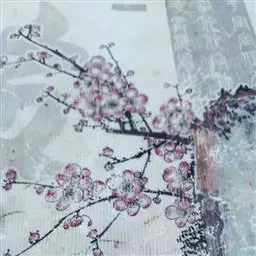 此图绘碧桃两枝,枝上的碧桃花有的吐露盛开,有的含苞欲放。花瓣用细笔勾描后多层晕染,富有层次变化和立体感。全图用笔精细,设色淡雅,画面虽小,意趣无穷。