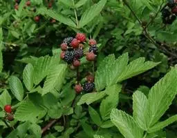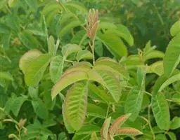 单叶互生,椭圆状或披针形,长7-15厘米,宽2-3.5厘米,先端渐尖,基部宽楔形,上面无毛,下面在脉腋间具少数短柔毛或无毛,叶边具细锯齿,齿端具腺体或无腺体;叶柄粗壮,长1-2厘米,常具1至数枚腺体,有时无腺体。 [2-3]