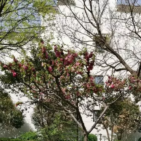 重瓣花朵,叶子紫。喜欢温暖向阳的环境,株高3-5米,灰褐色树皮,红褐色小枝,鲜红色幼叶,紫红色叶片,桃红色花瓣。先开花后生叶,很是可爱养眼,很适合观赏种植。