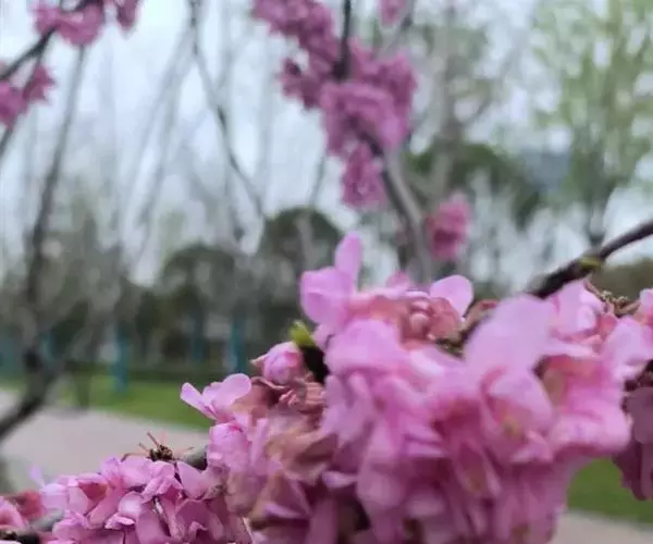 碧桃是蔷薇科桃属落叶植物桃的变种和培育品种。小乔木,高可达8米,一般整形后控制在3-4米之间。树冠宽广而平展,广卵形;树皮灰褐色,老时粗糙呈鳞片状;枝条多直立生长,小枝细长,嫩枝绿色或带红、色,以后转为红褐色,无毛,平滑稍有光泽,具大量小皮孔;冬芽圆锥形,顶端钝,外被短柔毛,常2-3个簇生,中间为叶芽,两侧为花芽。 [2-3]