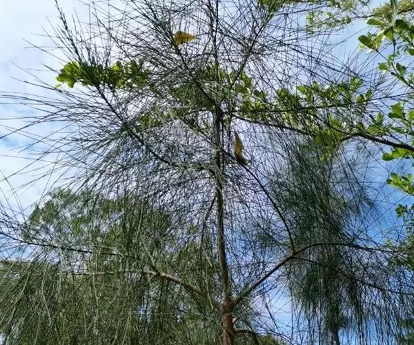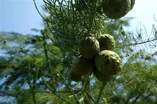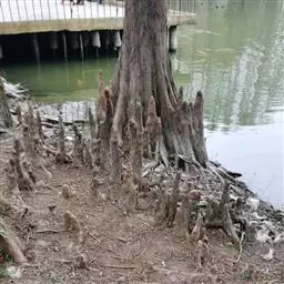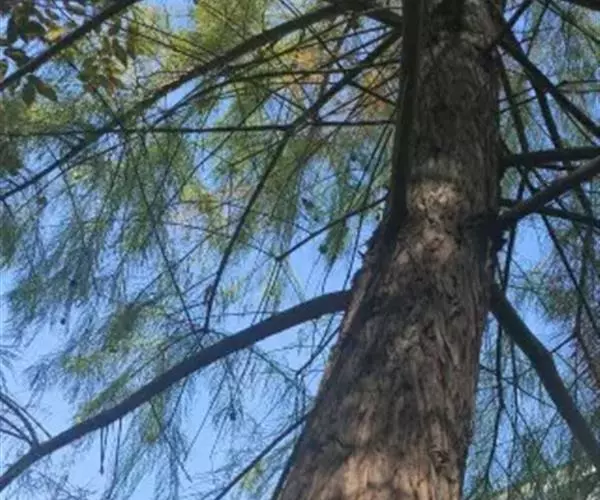 池杉 乔木,在原产地高达25米;树干基部膨大,通常有屈膝状的呼吸根(低湿地生长尤为显著);树皮褐色,纵裂,成长条片脱落;枝条向上伸展,树冠较窄,呈尖塔形;当年生小枝绿色,细长,通常微向下弯垂,二年生小枝呈褐红色。