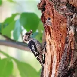 啄木鸟用嘴敲击树干,在寂静的林中发出“笃,笃……”的声音,如果发现树干的某处有虫,就紧紧地攀在树上,头和嘴与树干几乎垂直,先将树皮啄破,将害虫用舌头一一钩出来吃掉,将虫卵也用粘液粘出。当遇到虫子躲藏在树干深部的通道中时,它还会巧施“击鼓驱虫”的妙计,用嘴在通道处敲击,发出特异的、使害虫产生恐惧的击鼓声,使害虫在声波的刺激下,昏头转向,四处窜动,往往企图逃出洞口,而恰好被等在这里的啄木鸟擒而食之。它们一般要把整株树的小囊虫彻底消灭才转移到另一棵树上,碰到虫害严重的树,就会在这棵树上连续工作上几天,直到全部清除害虫为止。