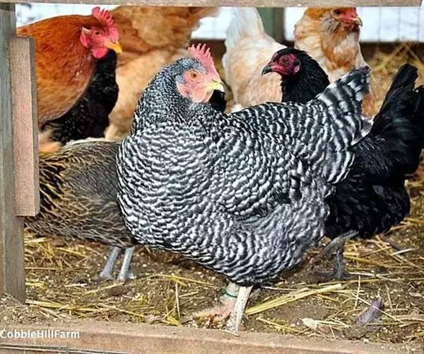 属蛋肉兼用型鸡种。该鸡体型一致,颈部挺立,稍显高昂,前躯稍窄,背长而平直,后躯宽而丰满,腿较长,尾羽高翘,体形呈“元宝”状。横斑羽是该鸡外貌的基本特征。全身大部分羽毛呈黑白相问、宽窄一致的斑纹状。母鸡头部和颈羽边缘镶嵌橘红色或土黄色,羽毛紧密。公鸡颈羽和鞍羽多呈红色,尾羽黑色带有绿色光泽。单冠最多,豆冠、玫瑰冠、豌豆冠和草莓冠较少。喙基部为黑色,边缘及尖端呈白色。虹彩橘红色。胫色以白色为主。爪部颜色大多白色,皮肤白色。成年鸡体重:公1400克,母1260克。180日龄屠宰率:半净膛,公81.2%,母80.0%;全净膛,公71.2%,母68.9%。开产日龄150~180天,在农村一般饲养管理条件下,年产蛋130~150个;较好饲养条件下产蛋180~200个。蛋重45克,蛋壳多为浅褐色 。