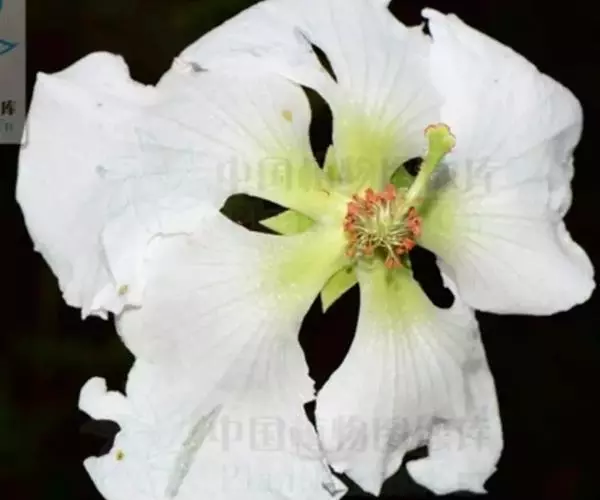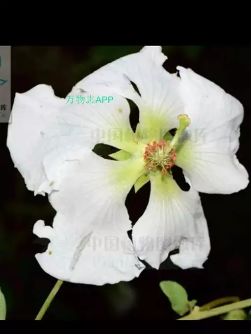 花:花单生于叶腋,花梗长2.5-6厘米,密被黄色星状绒毛,端具节;小苞片6,匙形,长8-12毫米,基部合生,密被黄色星状绒毛,花萼杯状,直径约2厘米,长2-2.2厘米,密被黄色星状绒毛,裂片5,三角状渐尖形,长为花萼的1/2,长2.5-3厘米,外面密被黄色星状长绒毛,内面疏被长柔毛,基部具髯毛;雄蕊柱长2-2.5厘米,不外露,花药红黄色;花柱枝5,具长丝状毛。