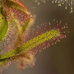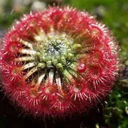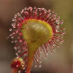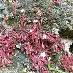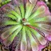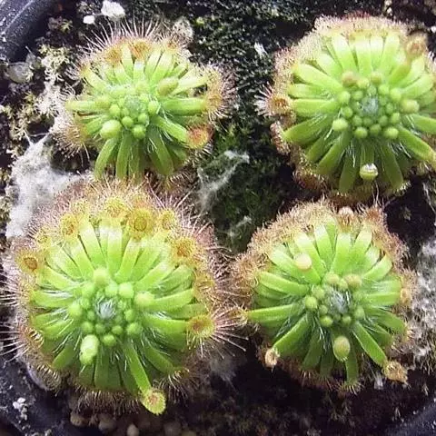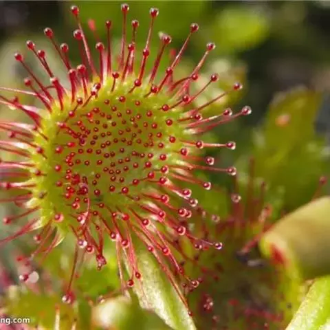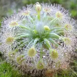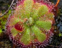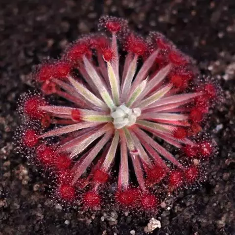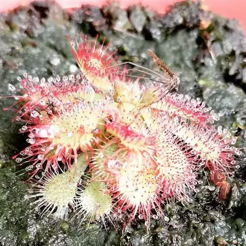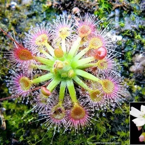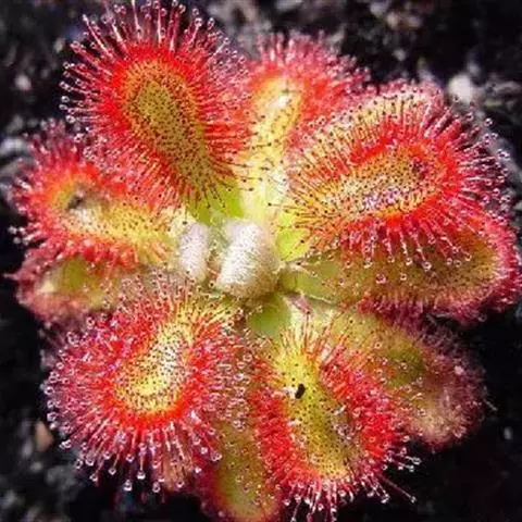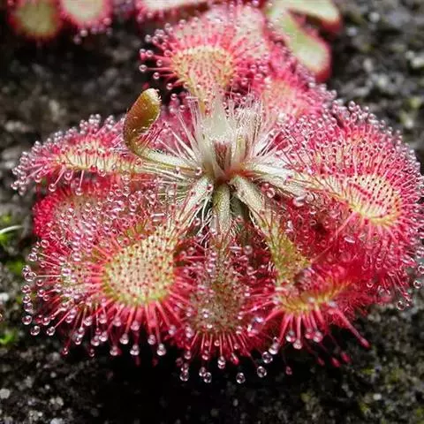 阿帝露茅膏菜 草本,通常多年生,直径2-20厘米;根状茎短,具不定根,常具有根功能的退化叶,末端具或不具鳞茎状球茎。叶互生或基生而莲座状密集,被头状粘腺毛,幼叶常拳卷;托叶膜质,常条裂。聚伞花序顶生或腋生,幼时弯卷;花萼5裂,稀4-8裂,基部多少合生,宿存;花瓣5,分离,花时开展,花后聚集扭转,宿存于顶部;雄蕊与花瓣同数,互生;子房上位,1室,侧膜胎座2-5,胚珠多数,稀少数;花柱3-5,稀2-6,呈各式分裂或不裂,宿存。蒴果,室背开裂;种子小,多数,外种皮具网状脉纹。花期4-5月,但有时会在某些环境刺激下在开花,小花红色。