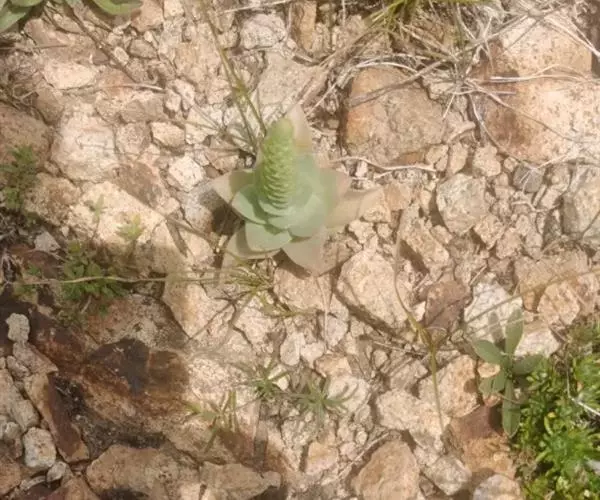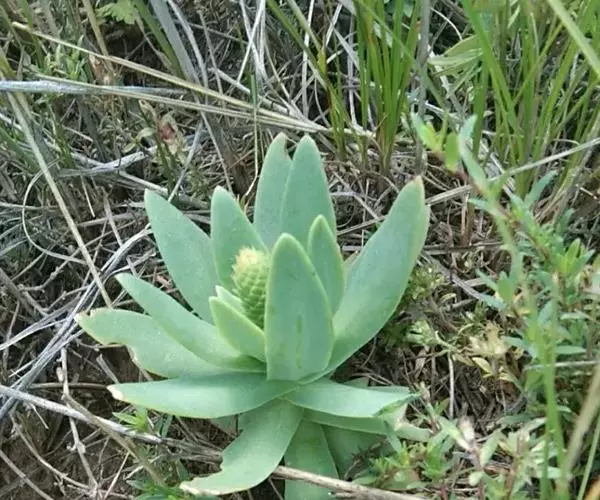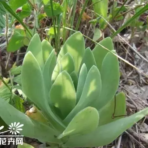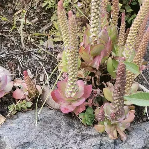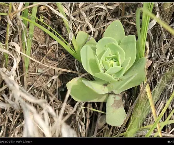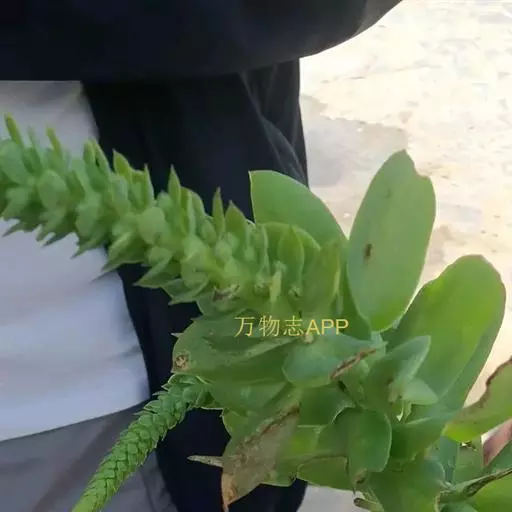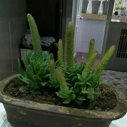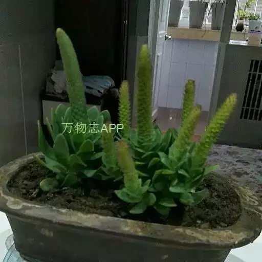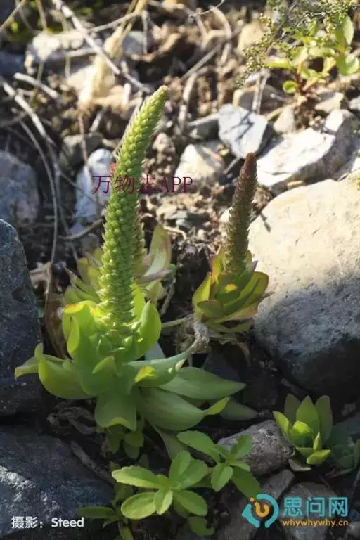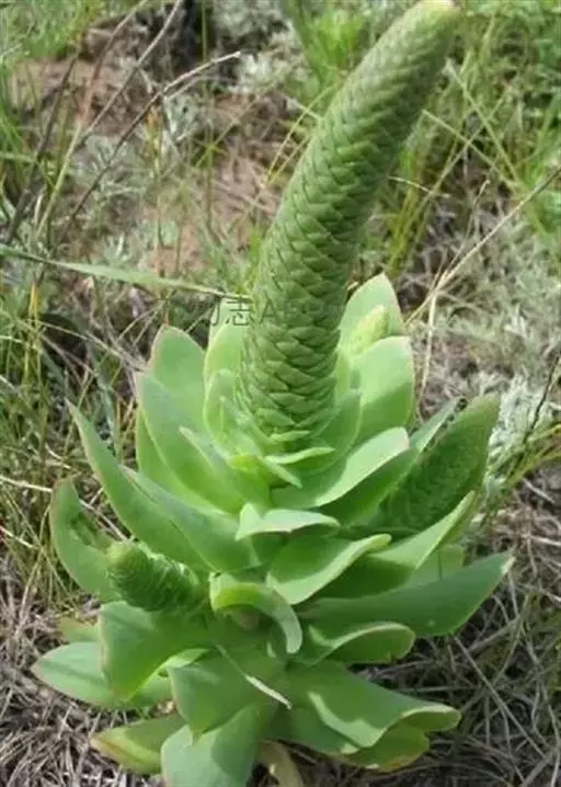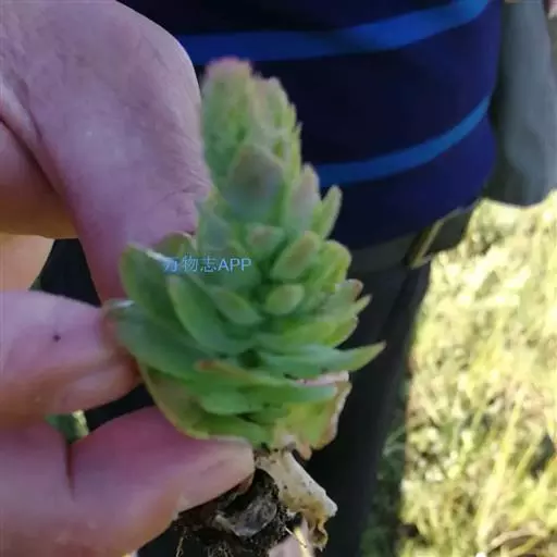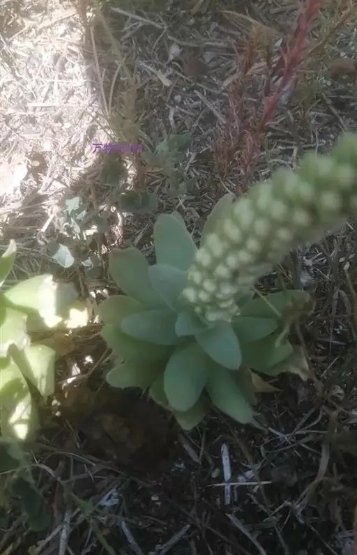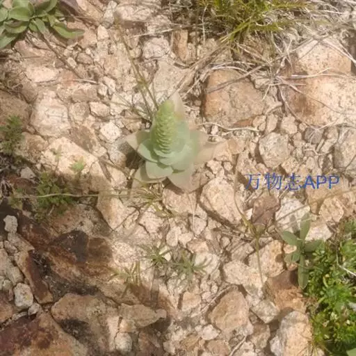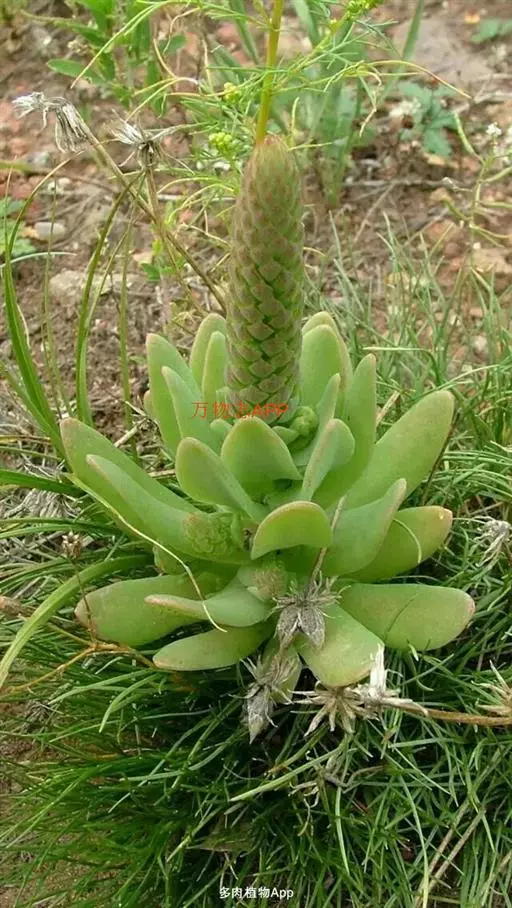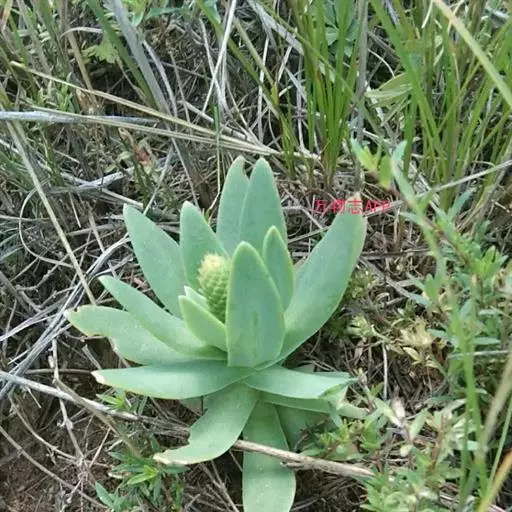 二年生草本。第一年植株有莲座丛;莲座叶先端不具刺,先端钝或短 钝叶瓦松 Orostachys malacophylla (摄影师:薛凯) 渐尖,长圆状披针形、倒卵形、长椭圆形至椭圆形,全缘。