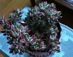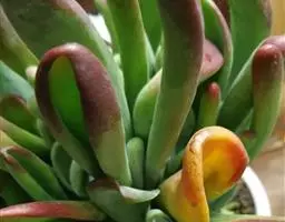 叶无柄,对生,密集排列成四列,叶片心形或长三角形,基部大,逐渐变小,顶端最小,接近尖形。叶色浓绿,在冬季和早春的冷凉季节或阳光充足的条件下,叶呈红褐或褐色,叶缘有白色角质层。整个植株叶片排列紧密而整齐,由基部向上逐渐变小,形成宝塔状,是一种奇特而美丽的多肉植物。