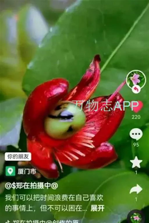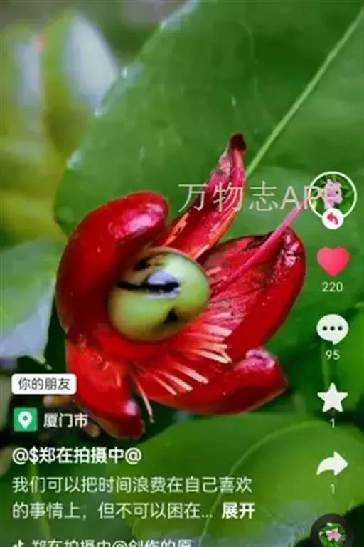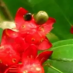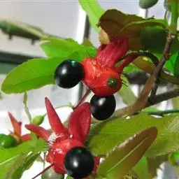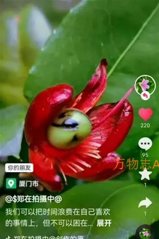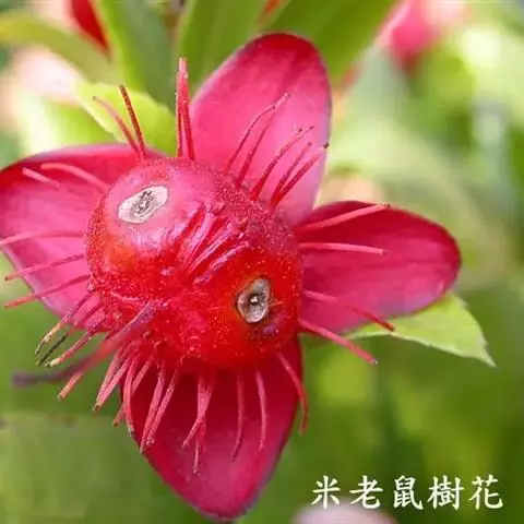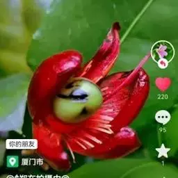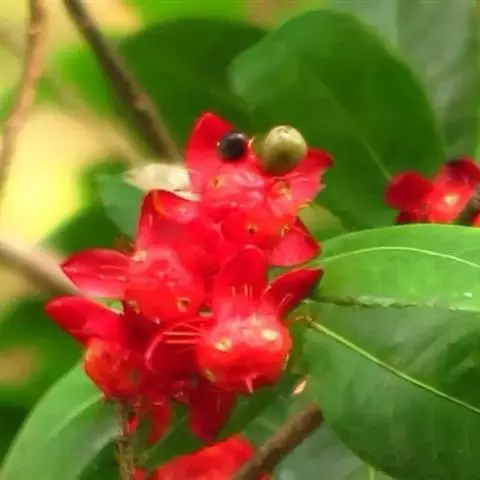 花小,两性,直径2-4厘米,离瓣花;花萼5片,结果时增大,宿存,暗红色;花瓣5片似勺形,长2厘米左右,黄色;雄蕊多数,黄色,花丝宿存;子房上位。每朵花开后,花托上着生I-6个浆果状的小核果,橄榄形,径5-7毫米,长7-11毫米,果皮薄,未成熟时绿色,成熟时黑色,每个果实中有种子1粒,褐色。