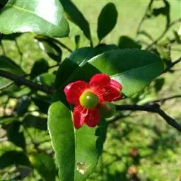 桂叶黄梅(学名:Ochna thomasiana Engl. & Gilg)是金莲木科,金莲木属常绿灌木,株高可达3米,树干修长,树皮褐色,叶互生,近无柄;叶片椭圆形,革质,边缘有针状锯齿,中脉明显。花小,两性,离瓣花;花萼结果时增大,宿存,暗红色;花瓣黄色;雄蕊多数,花丝宿存;子房上位。果皮薄,未成熟时绿色,成熟时黑色,每个果实中有种子1粒,褐色。