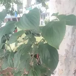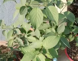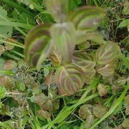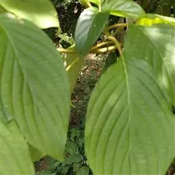叶对生,薄纸质,多少为长圆卵形,长7-8厘米,宽4-5.5厘米,先端钝尖或渐尖,基部宽楔形或近于圆形,有时两侧稍不对称,上面黄绿色,疏被黄色平贴短柔毛,下面淡白色,密被白色乳头状突起及稀疏的平贴短柔毛,中脉在上面微凹下,下面凸出,侧脉7-8对,在上面稍凹下,下面明显;叶柄纤细,长1.5-2厘米,疏被黄色贴生短柔毛,上面有浅沟,下面圆形。