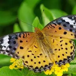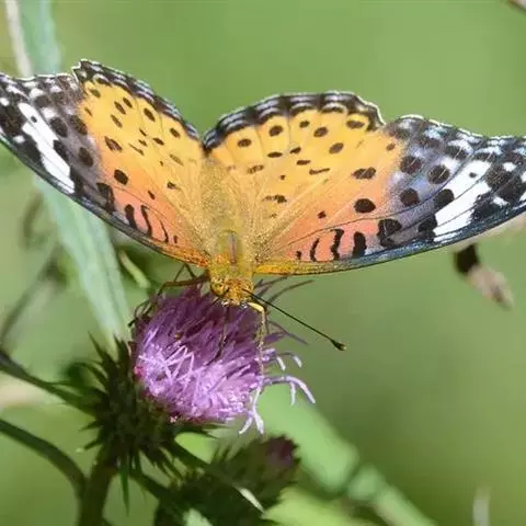 绿豹蛱蝶,属鳞翅目(Lepidoptera),蛱蝶科(Nymphalidae)豹蛱蝶属。分布在 黑龙江,辽宁,吉林,河北,河南,新疆,宁夏,陕西,甘肃,浙江,四川,西藏,湖北,江西,福建,广西,广东,云南,台湾;欧洲,日本,朝鲜,非洲等。翅面橙黄微有褐色,斑纹黑色,翅基色暗,密布褐色绒毛,中室内有4条横纹,外缘有1列连续黑斑。其内侧有2列平行黑斑;中室外有3个黑斑排列为三角形。